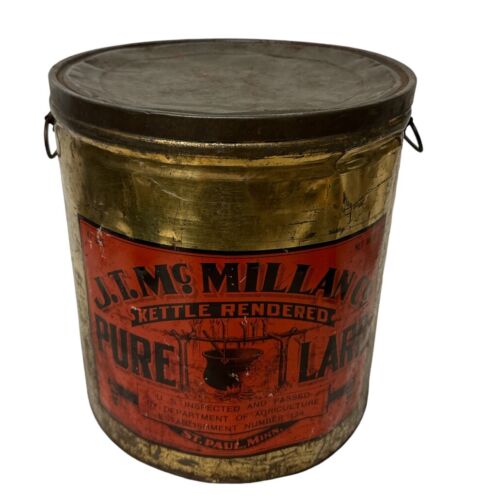 Antique Rare 47 Pound Tin J.T McMillan Co. Kettle Rendered Pure Lard St. Paul Mn