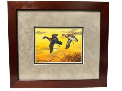 Original Rhynard Klingbeil Watercolor painting framed signed "Sunset" Wood Ducks