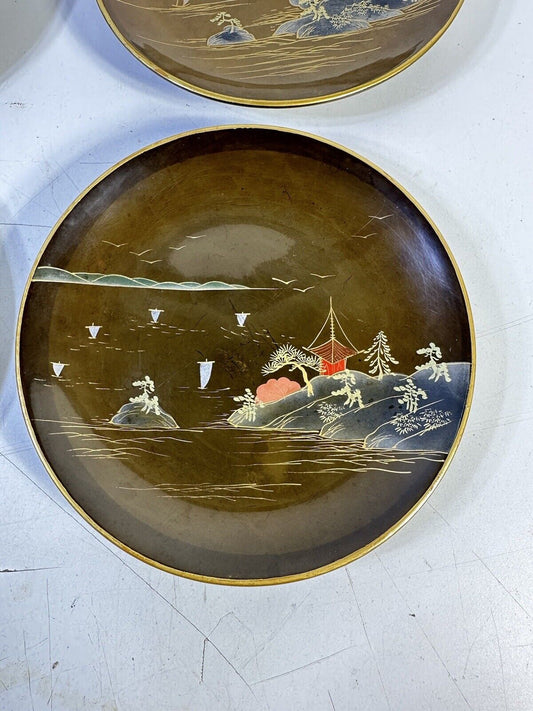 Lot Of 4 Vtg Japanese Coco Lacquer Ware Handpainted Landscape Plate, 6 3/4" Dia