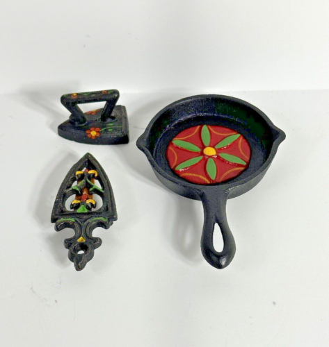 Lot of 3 Vintage Mini Cast Iron trivits including frying pan and sad iron
