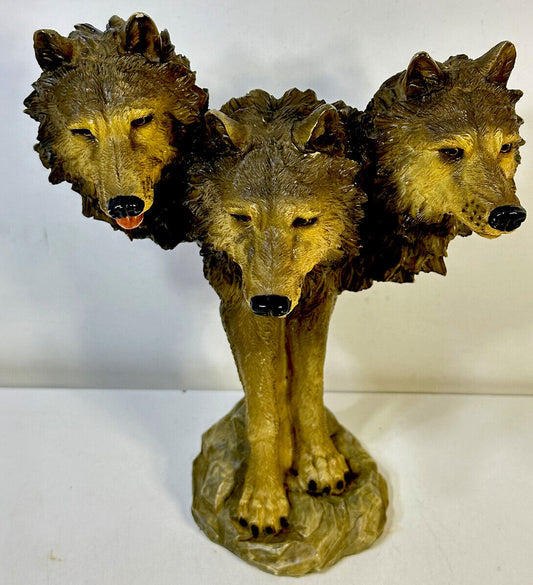 3 Wolf Heads Bust Sculpture Figurine 8.5” Resin Folk Art Table Decor