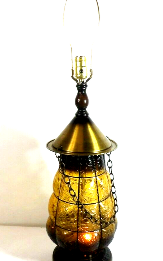Vtg Mid Century Modern Stained Yellow Glass Globe Crackle Glass Gothic Lamp