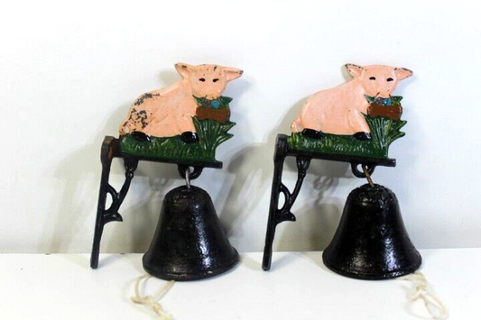 Set of 2 matching Cast Iron Pig design and wall hanging bells working