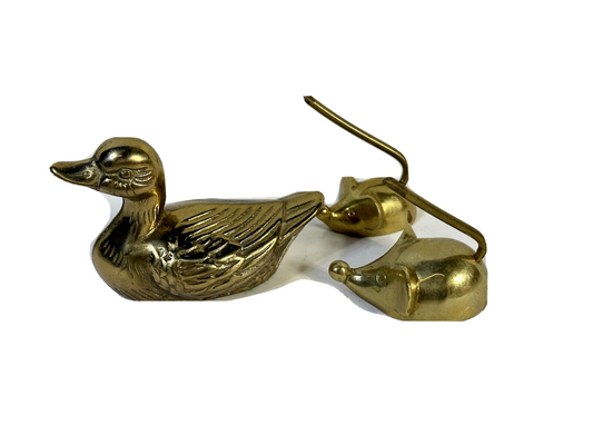 Small Hollow Brass Duck and 2 Brass Mice paper weight collectible Animal Figures