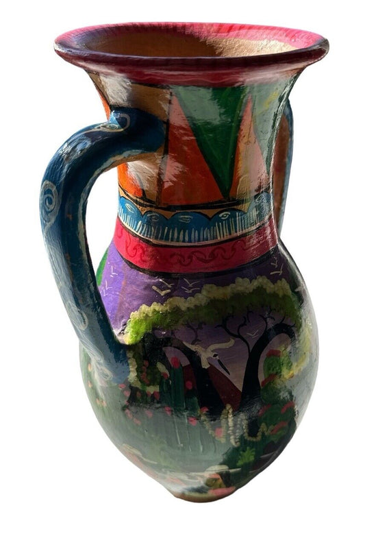 Vintage Beautiful Hand Painted Mexican Double Handled Vase Vessel Folk Art