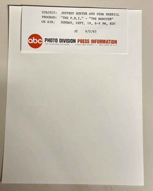 1965 Press Release Photo The FBI “ The Monster” Jeffrey Hunter & Dina Merrill