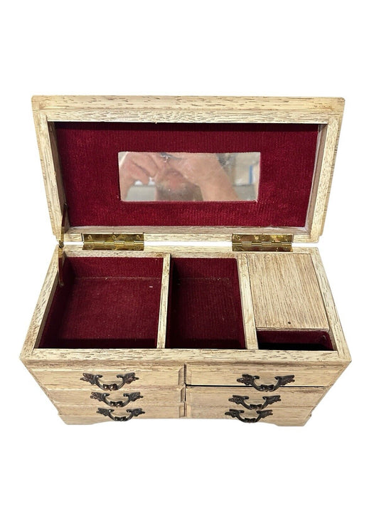 Norleans Wood Footed Jewelry Music Box Japan Made Red Velvet w/Mirror Vintage