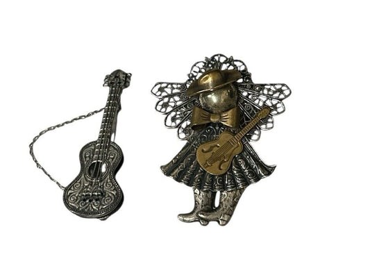 Lot of 2 Vtg silver brass cowgirl angel and Napier silver guitar brooch pin