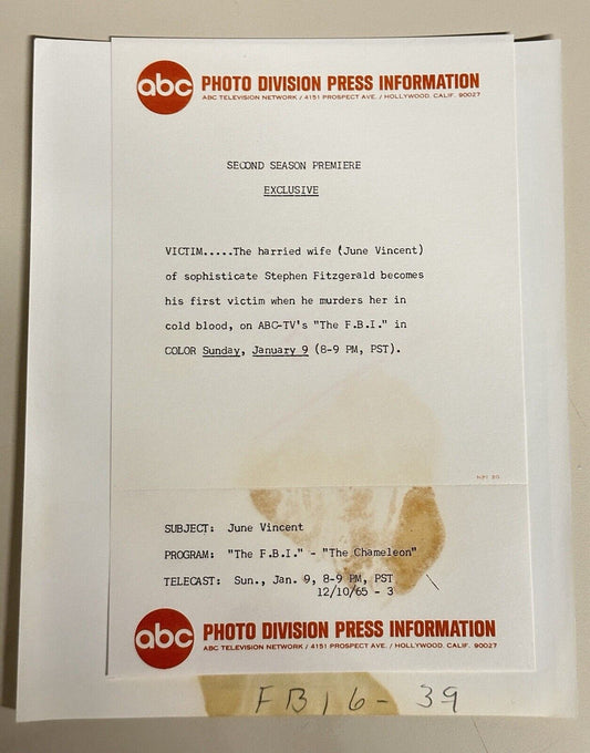 1965 Press Release Photo Scene From The FBI “ The Chameleon” June Vincent