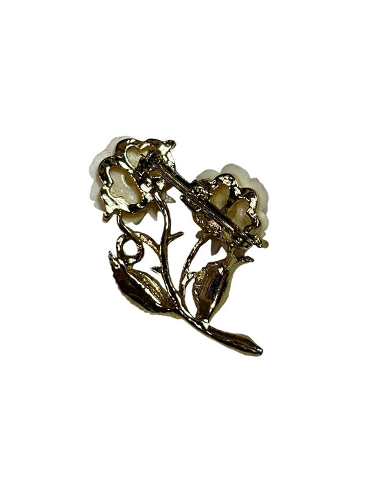 Vtg Gold Tone Carved Resin Double Rose Brooch Pin Off White Flower