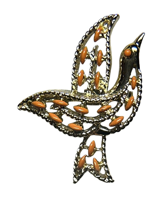 Vtg GERRY'S Dove Brooch Bird Pendant Gold Tone Orange Enamel Accent Flying Peace