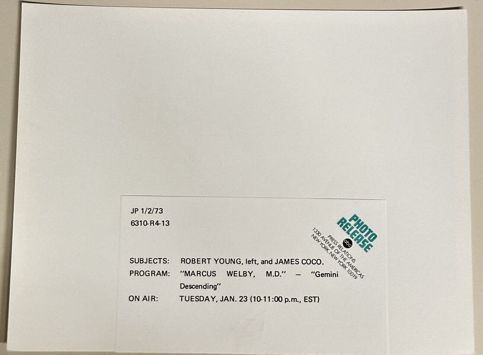 This is a vintage 1973 press release photo featuring Marcus Welby M.D. stars Robert Young and James Coco. The photograph is in black and white, with a size of 7" x 9", and is an original piece made in the United States. It is a great addition to any entertainment memorabilia collection, especially for fans of television and photographs.
