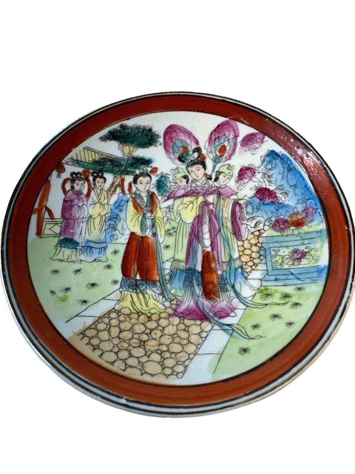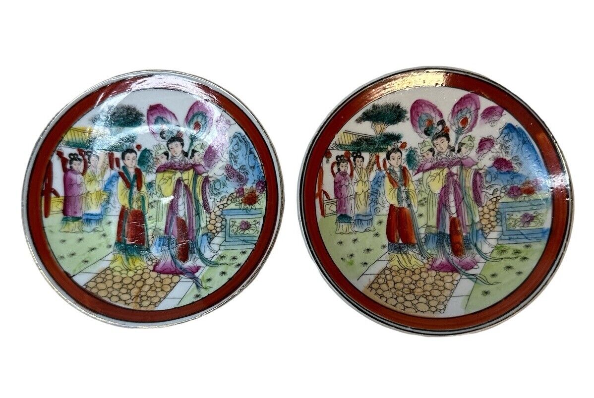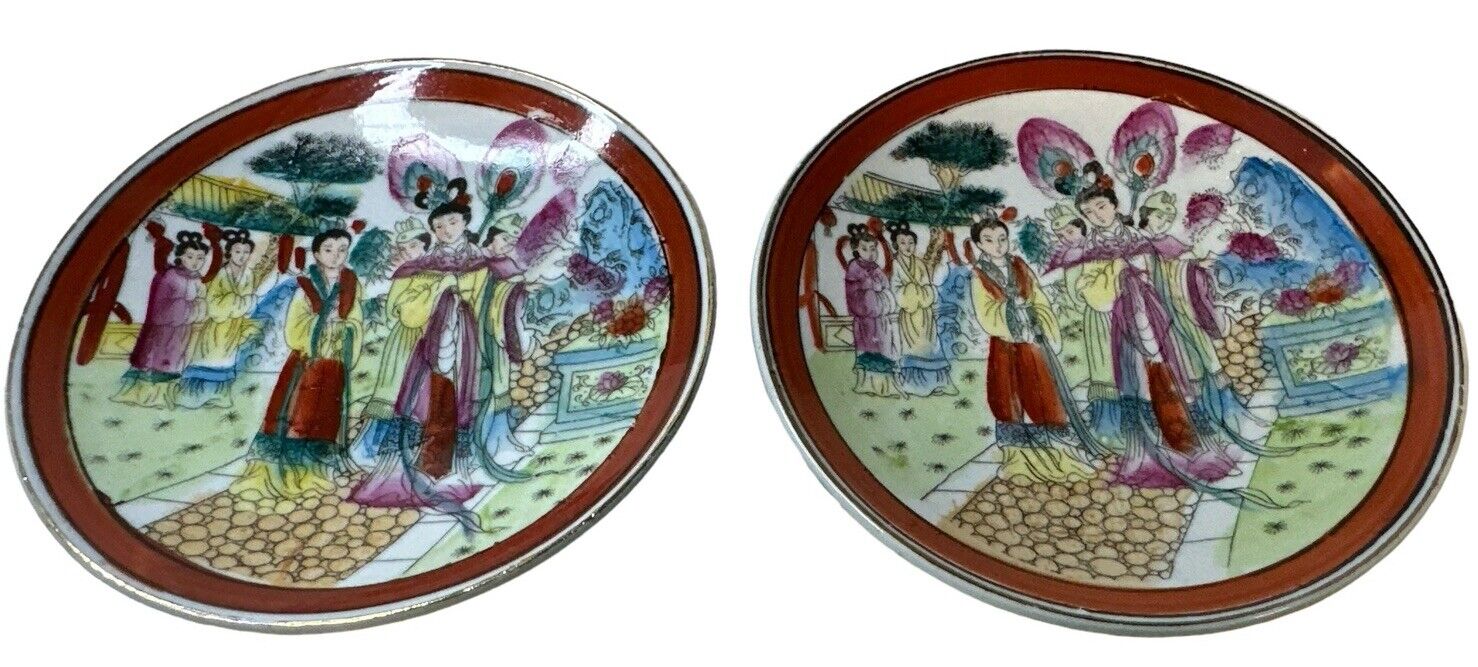 Pair Of Vtg 4.5" Japanese Scene Hand Painted Plates Pre-owned Fair Condition