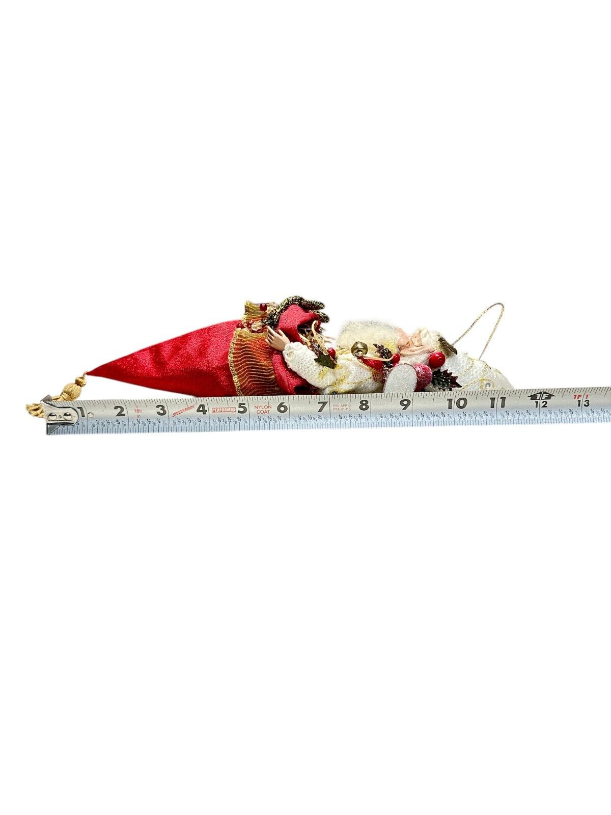 Add a touch of magic to your Christmas tree with this rare Santa Claus Mark Roberts ornament. The fairy is depicted wearing a red and white hat with a multi-finish design, and comes in a medium size. Perfect for collectors and fans of the Victorian style, this ornament features a beautifully detailed figurine of a fairy in a mistle toe gift bag, measuring 12 inches in length. The ornament is perfect for anyone who loves fairies and wants to add a unique touch to their holiday decor.Share
