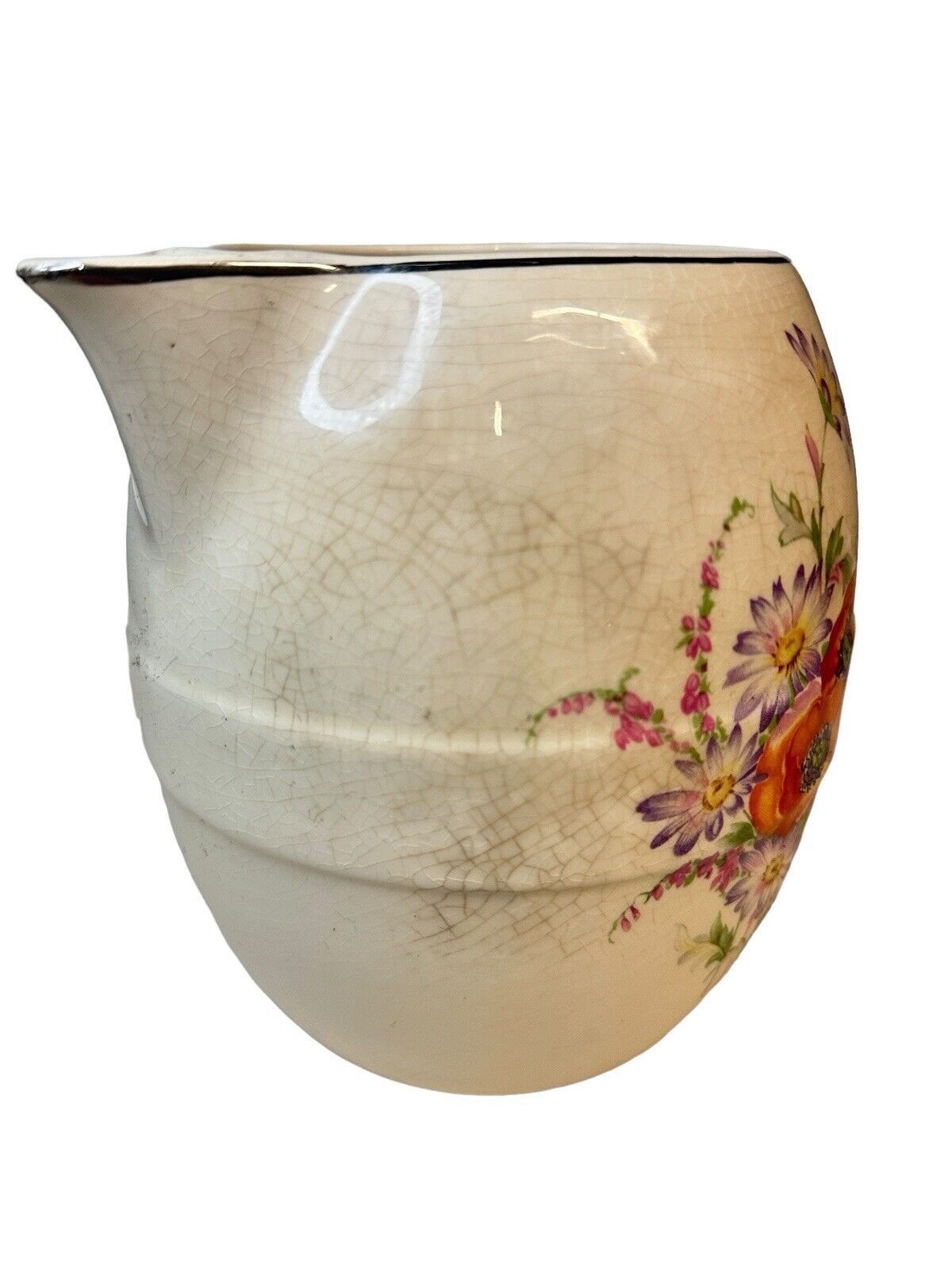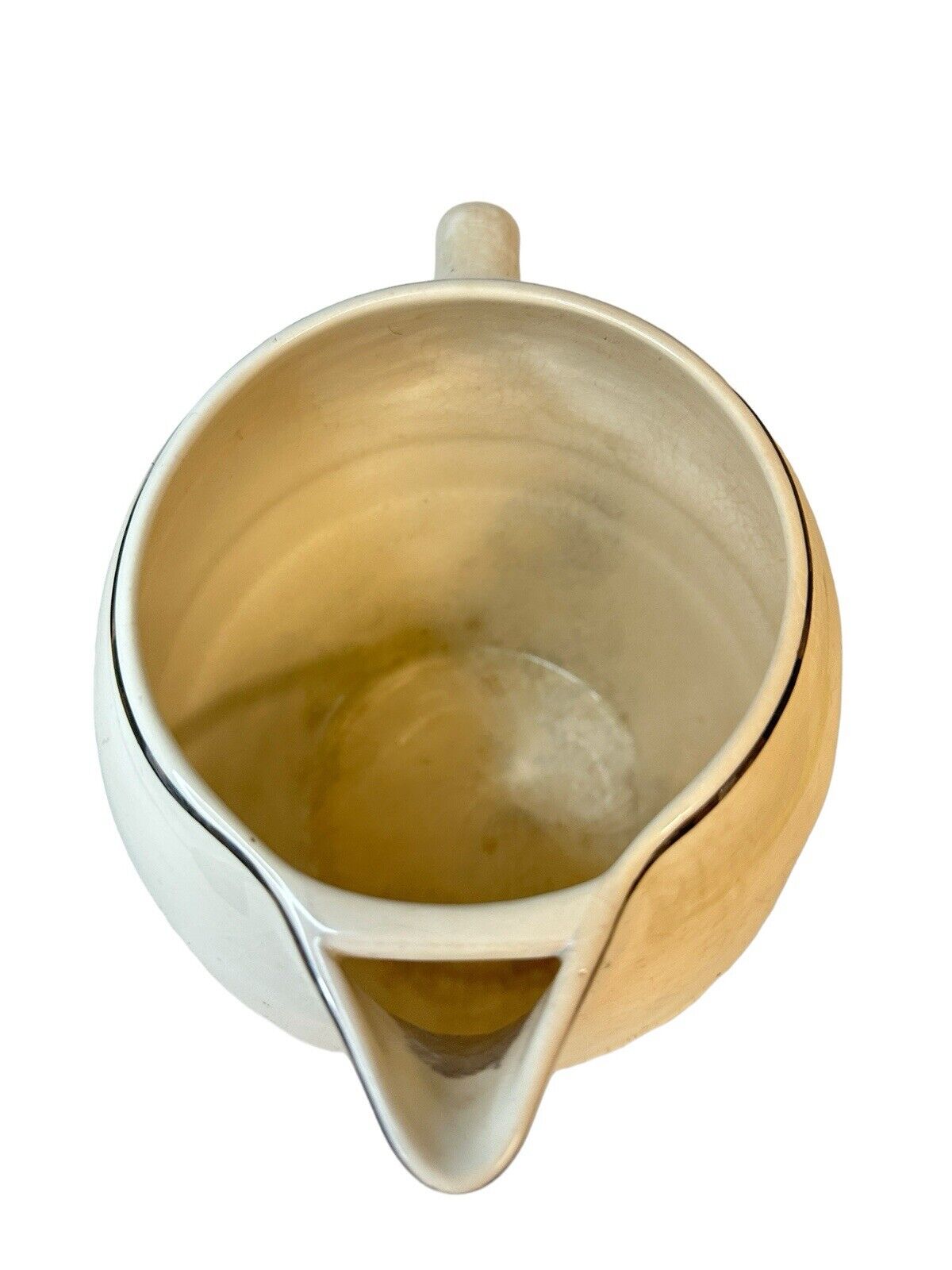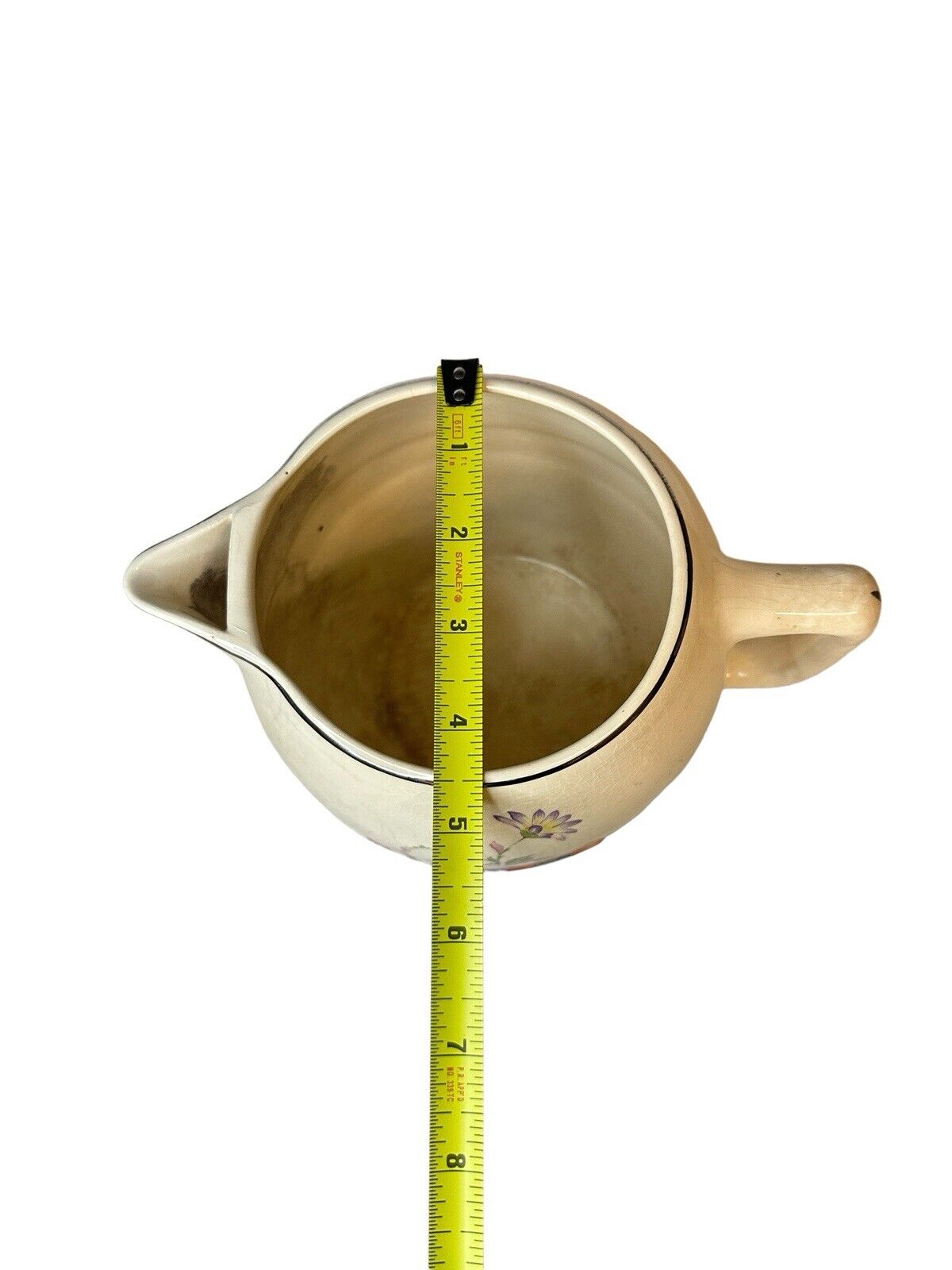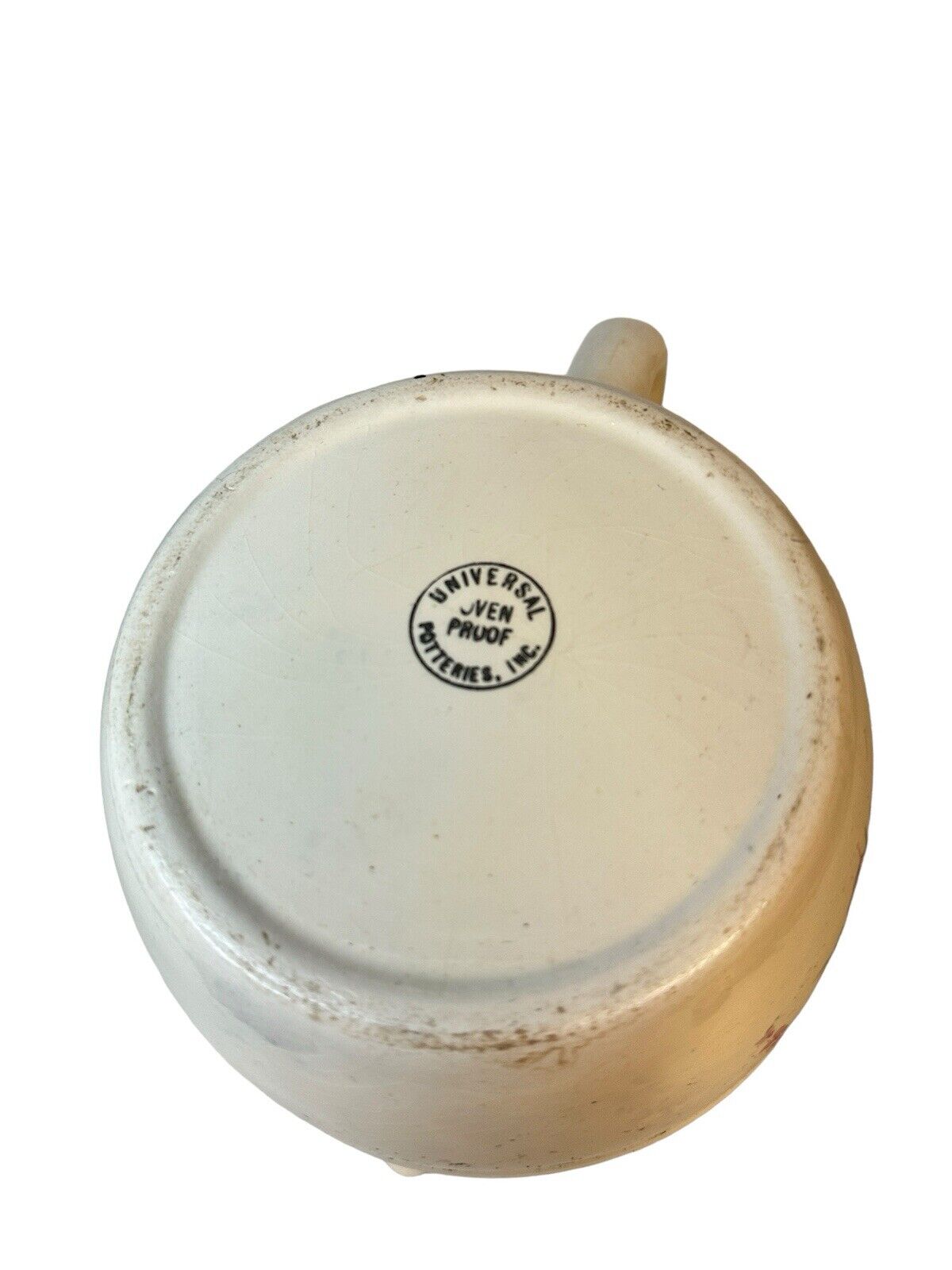 This vintage pitcher from Universal Potteries is an exquisite piece of art with a floral pattern and cream color. Crafted from porcelain and ceramic, this pitcher has a depth of 7" and a height of 7". The backstamp is printed, and it weighs 2.4lbs.